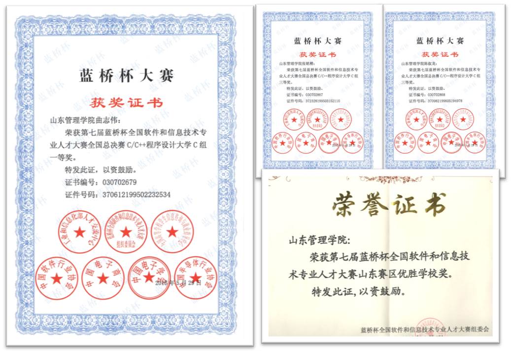 近日,第七届“蓝桥杯”全国软件和信息技术专业人才大赛全国总决赛在北京大学圆满落幕。我校信息工程学院同学再次荣获佳绩,2013级计算机应用技术专业曲志伟同学成功获得全国一等奖,2014级软件技术专业张铭楷、陈叙龙同学也取得全国三等奖的优异成绩,我校被评为优胜学校奖,阮梦黎、赵丽丽老师被评为优秀指导教师。根据大赛规定,三位同学将获得北京大学软件与微电子学院等13所院校的硕士研究生面试资格,并优先录取为该院校普通硕士研究生,同时获得免除笔试,直接进入百度、IBM等企业在员工招聘中的面试机会。