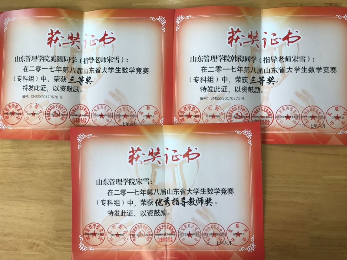 近日,第八届山东省大学生数学竞赛成绩公布,信息工程学院组织学生积极参赛,2015级物联网应用技术专业学生奚灏、2015级计算机网络技术专业学生韩梅分别荣获省级三等奖。宋雪获得优秀指导教师奖。