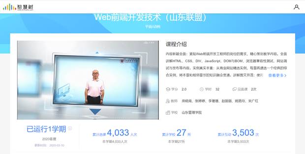 2月份开课后,立即受到了本校及其他兄弟院校师生的热烈欢迎和广泛好评。截止到2020年3月10日,本学期选课人数已达到4033人,选课高校覆盖全国12个省市自治区,包括云南师范大学、吉林警察学院、东北石油大学、山东建筑大学等共27所,其中山东省9所,吉林省3所,河南省、黑龙江省、辽宁省、云南省和内蒙古自治区各2所,福建省、广东省、湖北省、四川省和上海市各1所。选课班级98个,课程累计互动3503次,参与测试人数2342人。据统计,在智慧树平台上以“Web前端”和“网页设计”为主题的课程中,该课程在选课人数、选课学校数量、班级数量和互动次数都明显高于其他院校上线课程。