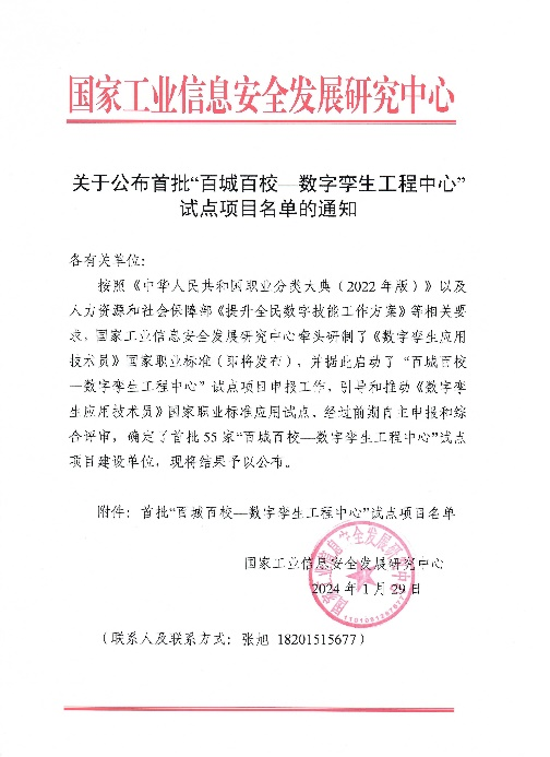 “百城百校—数字孪生工程中心”试点项目是国家工业信息安全发展研究中心主要依据即将发布的《数字孪生应用技术员》国家职业标准要求,围绕数字孪生领域人才培养、技术研发、教学研究、实践实训四个方向开展的项目建设。