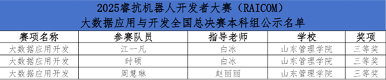近日,2025年睿抗机器人开发者大赛(RAICOM)全国总决赛-大数据应用开发竞赛结果公布,经过激烈角逐,我院学子江一凡、时硕、周慧琳荣获国家级三等奖,这是我院连续第二年在该项赛事中获得国赛奖项。