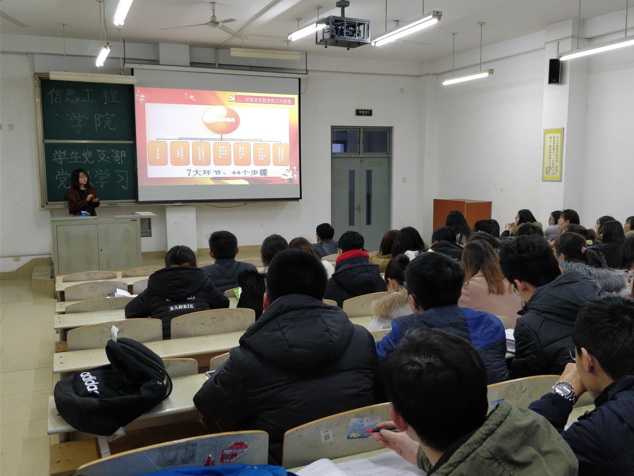 信息工程学院学生党支部于2018年3月6日晚在C#402教室开展了以“高校党员发展流程”为主题的党课教育,旨在引导学生入党积极分子明确入党条件,了解入党程序,强化入党积极分子的对党组织的认知。本次党课由学生党支部书记尹丛丛老师讲授,信息工程学院学生党员和学生入党积极分子参加了学习。