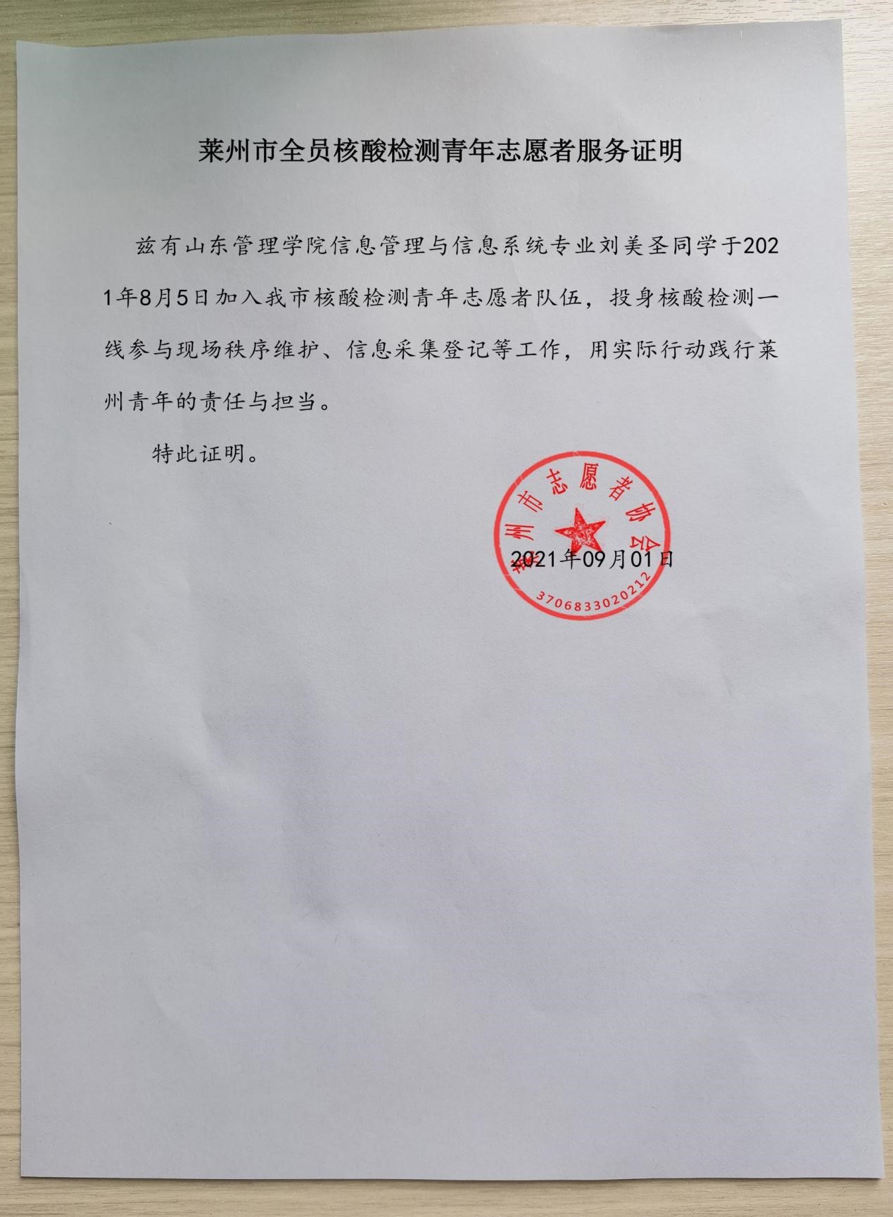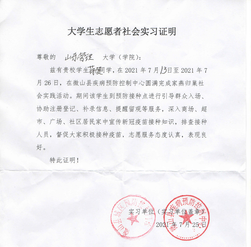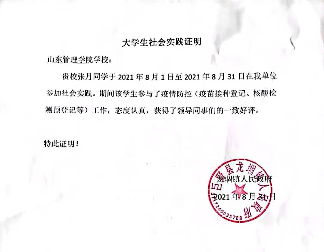 2021年8月,信息工程学院2020级软件工程专业学生张月参加了山东省巨野县龙堌镇组织的青少年新冠疫苗接种接种志愿者服务工作。