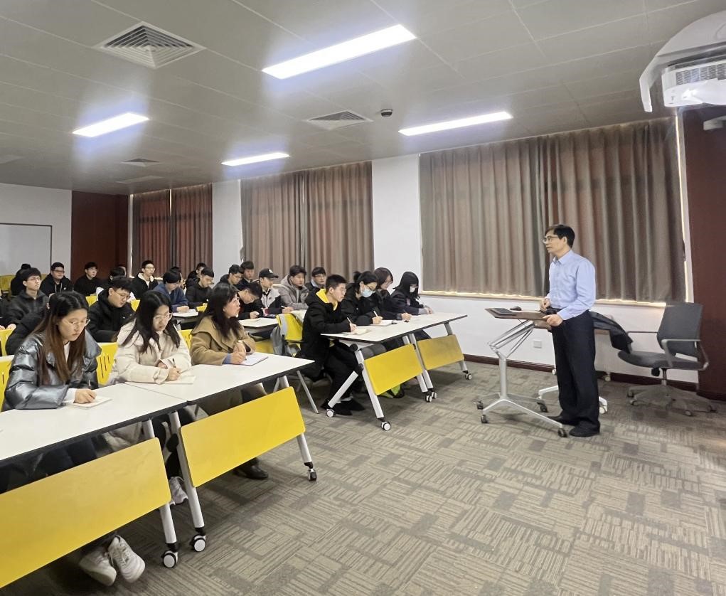 12月15日,院长邹广德在明志楼103教室为所联系班级——2019级计算机科学与技术专业3班全体学生宣讲党的十九届六中全会精神。