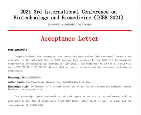 ⑤2021年5月,在第三届生物技术与生物医学国际学术会议(ICBB 2021)发表的论文《Development of a network visualization and analysis system for malignant tumors based on transcriptome data》(EI、SCOPUS、CNKI检索)已录用,第一作者耿泽政,通讯作者房晓南。