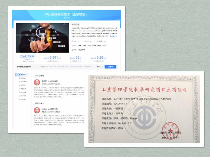 在疫情防控的关键时期,为了能够有效助力学校和兄弟院校的线上教学,使广大学子在线享受优质课程资源,房晓南带领课程团队成员进行了《Web前端开发技术》在线开放课程的建设。课程团队牺牲寒假休息时间,夜以继日的完成了课程资源建设、课程视频录制等各项任务,进一步丰富了课程资源,确保课程顺利上线运行。2月份开课后,该课程立即受到了本校及其他兄弟院校师生的热烈欢迎和广泛好评,选课高校覆盖全国12个省市自治区,包括云南师范大学、吉林警察学院、东北石油大学、山东建筑大学等。据统计,在智慧树平台上以“Web前端”和“网页设计”为主题的课程中,该课程在选课人数、选课学校数量、班级数量和互动次数都明显高于其他院校上线课程。日前,课程已运行两个学期,已累计选课5381人次,累计33所学校采用该线上课程。在此基础上,房晓南主持申报并获批校级教学研究项目一项。