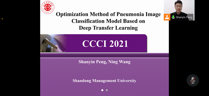 CCCI2021国际论坛为IEEE国际会议,会议论文录用率为48%并被EI检索,会议报告人员为来自中国、美国、法国、日本、印度等全球多个国家的行业专家。我校大三学生彭善银在王宁博士指导下撰写的论文《Optimization Method of Pneumonia Image Classification Model Based on Deep Transfer Learning》被CCCI会议录用,彭善银也以第一作者身份进行了全英文研究汇报,并与其他专家用英文进行了交流。彭善银在汇报人员中年龄最小,且是为数不多的本科在读生,他的出色表现,展现了我校学生的能力和风采。