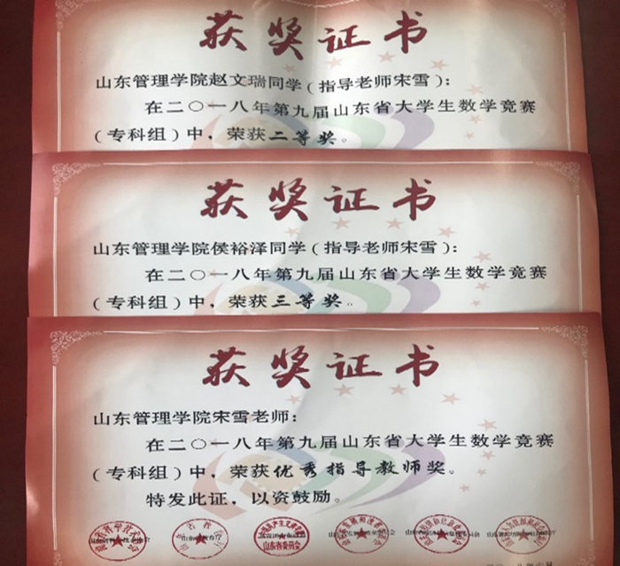 近日,第九届山东省大学生数学竞赛(专科组)成绩公布,我校参赛学生获得二等奖、三等奖各1项,信息工程学院宋雪获优秀指导教师奖。
