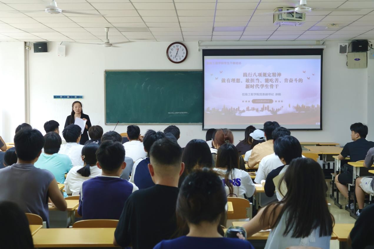 为加强学生干部队伍作风建设,推动学生工作高质量开展,6月9日,信息工程学院于博识楼201召开学生干部培训会。