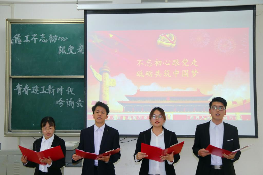 诗文咏诵会上,由学生党员代表、党员发展对象、入党积极分子分别组成的队伍,选取了《我用残损的手掌》、《放飞中国梦》、《不忘初心跟党走 砥砺共筑中国梦》等红色诗歌,紧贴歌颂十九大精神和中国梦主题,配以慷慨激昂的配乐,以饱满的热情、激昂的语言、大方得体的举止展现了对信仰的坚定、对祖国的抱负、对青春的歌颂。不忘初心跟党走,青春建功新时代,信息工程学院的青年学子,定会坚定理想信念,志存高远,脚踏实地,勇做时代的弄潮儿,在实现中国梦的生动实践中放飞青春梦想!
