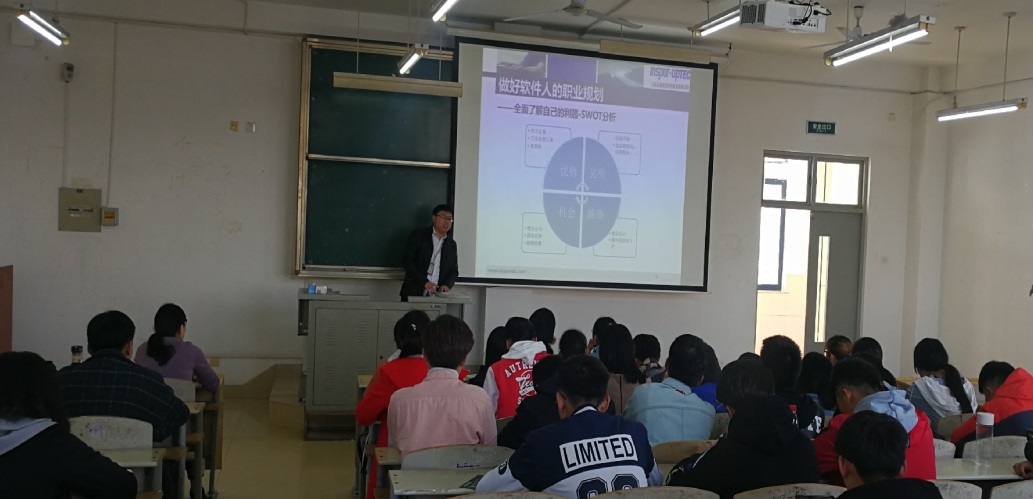 在职业规划讲座中,王建老师讲到每位同学都应对自己有全面了解,从优势、劣势、机会、威胁等多个方面分析自身情况,研究软件企业的主要技术岗位,如系统分析员、程序员,测试员、实施运维等,结合个人情况选择合适岗位,提前做好准备。王建老师还从个人经验出发,总结当前软件企业的人才需求,明确告知学生应提高的技能,需掌握的技术水平,并引入企业真实招聘案例。