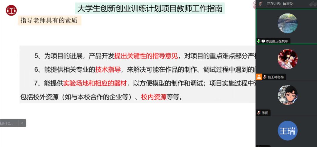 培训会上,陈言俊教授首先引出国创计划的概念、目的、要求,解析大创导师需要具备的素质条件及其作用,详细解读了选题方向、来源、原则、基本步骤等内容,强调了选题及申报的注意事项,提出有价值、可供参考的指导意见。随后,陈言俊教授深入浅出地解读了中期检查与结题验收相关事项,就大创省级平台的操作流程进行了详细讲解,让在场师生受益匪浅。