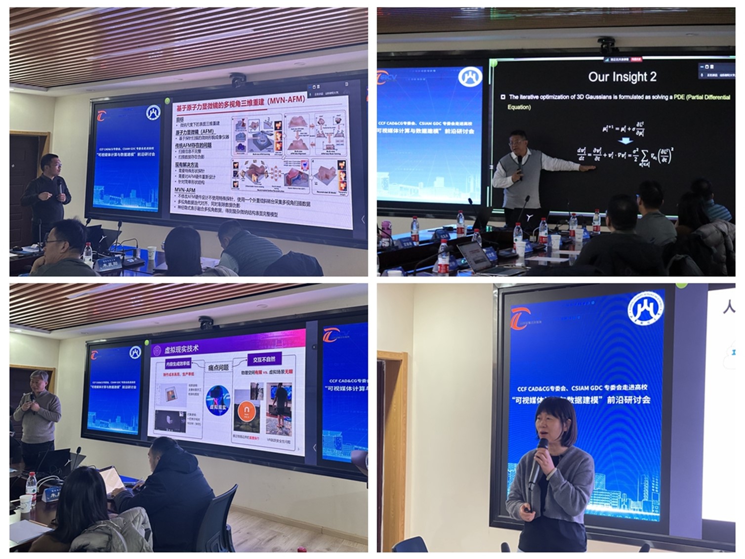 本次活动围绕“可视媒体计算与数据建模”主题开展交流和研讨,专委会主任、国家杰青、中国科学技术大学刘利刚教授,国家杰青、浙江大学章国锋教授,专委会秘书长、清华大学张松海副教授,清华大学软件学院副院长刘世霞教授分别作题为“多视点图像的3D重建与编辑”“基于神经网络和三维高斯表达的重建:从微纳结构到平方公里级场景”“三维场景高效合成”“基于可视分析的数据集构造集与质量提升探索”的报告,围绕“可视媒体计算与数据建模”主题开展交流和探讨,并围绕3D物体及场景重建等提出了许多建设性建议。